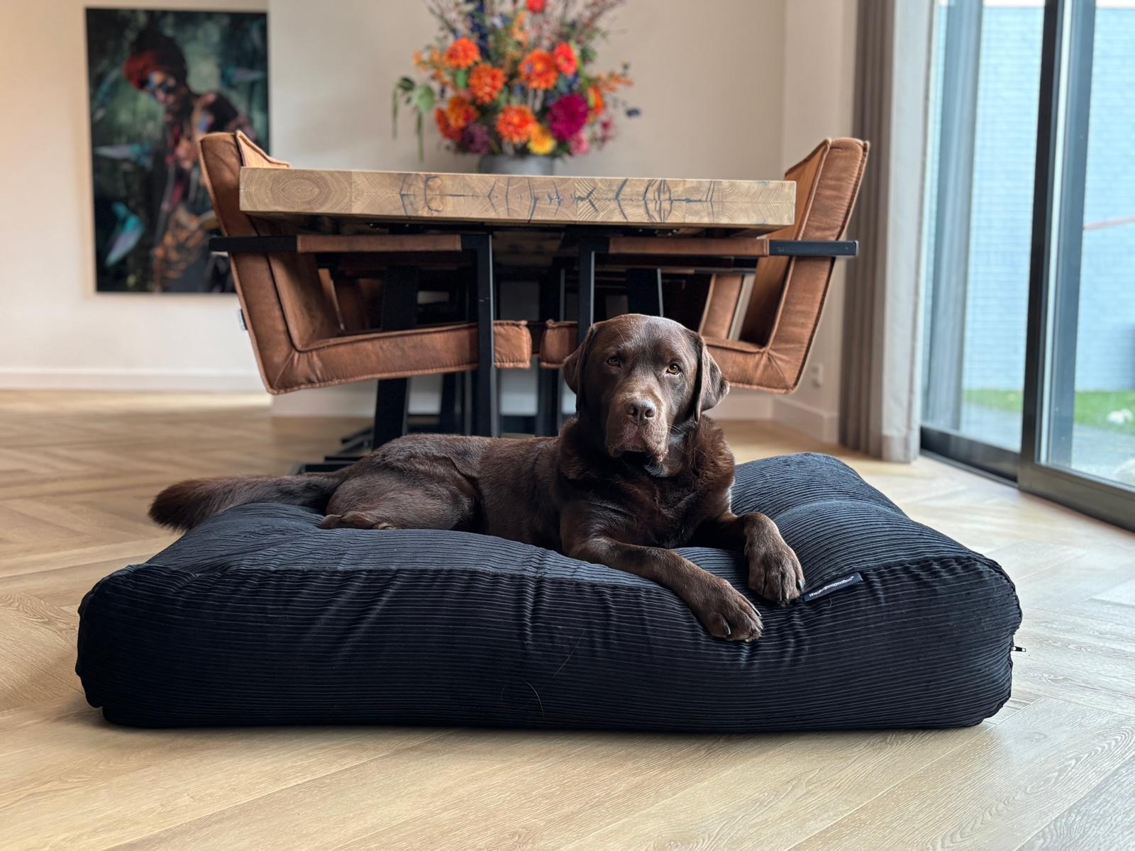 De zwart double ribcord losse hondenkussen hoes past in elk interieur. Modern, landelijk, klassiek of industrieel. Het is een lust voor het oog én het interieur. De hoes heeft aan de zijkant een rits waarmee je het kussen er gemakkelijk uit kan halen.